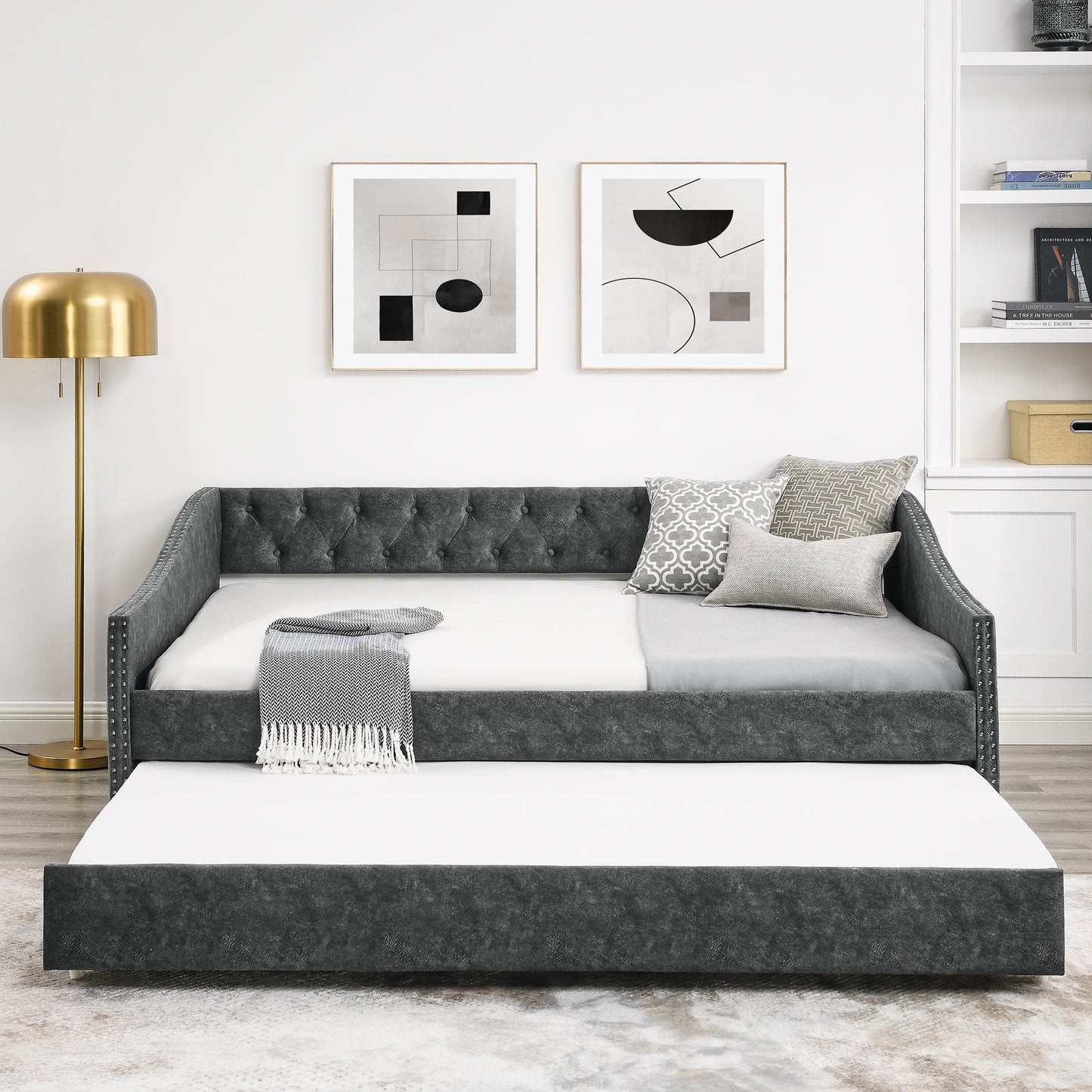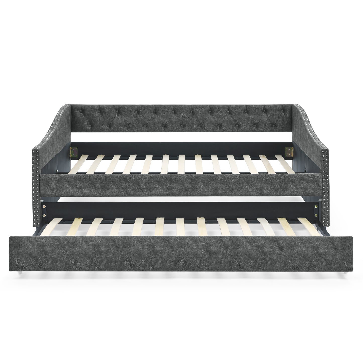 Full Size Daybed with Twin Size Trundle Upholstered Tufted Sofa Bed, with Button on Back and Copper Nail on Waved Shape Arms,Grey (80.5'x55.5'x27.5')