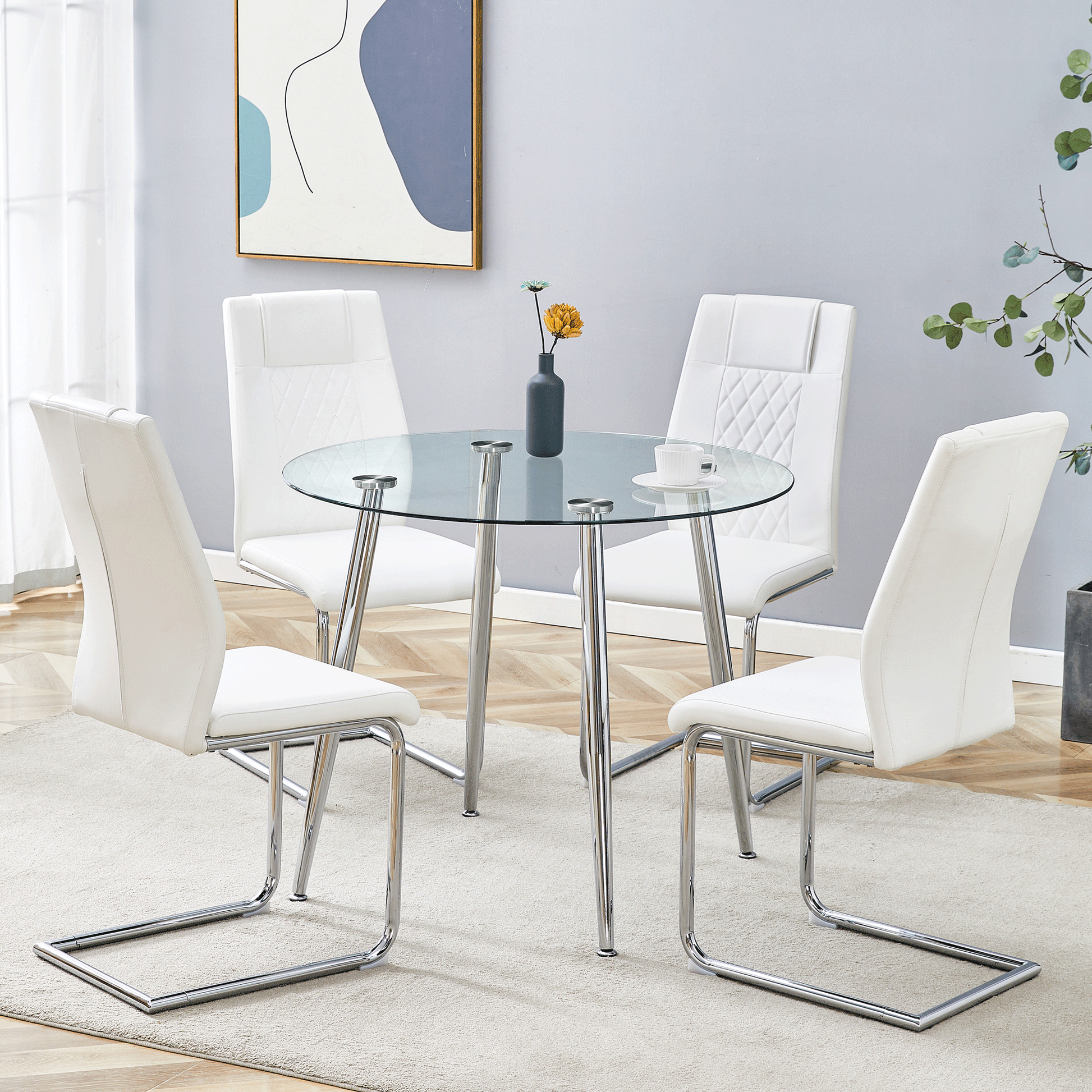 A modern minimalist round transparent tempered glass table with silver metal legs and 4 white modern PU leather high-backed dining chairs for a luxurious experience.