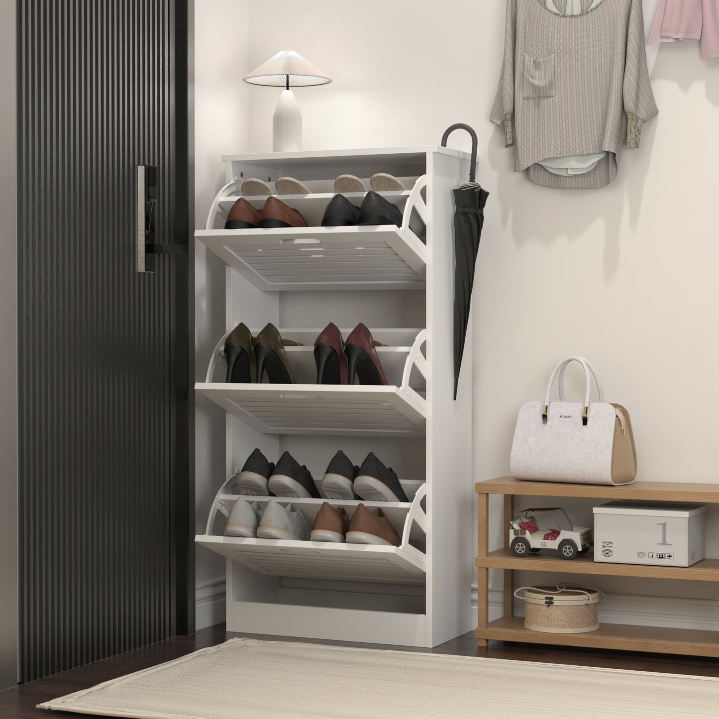 - Easy to Clean & Sturdy -- This 3 flip drawer shoe cabinet is crafted of MDF with a smooth, easy-to-clean surface. And its high-quality wood structure makes sure stability and durability. We are equipped with an anti-falling device behind the shoe rack cabinet for added security.
