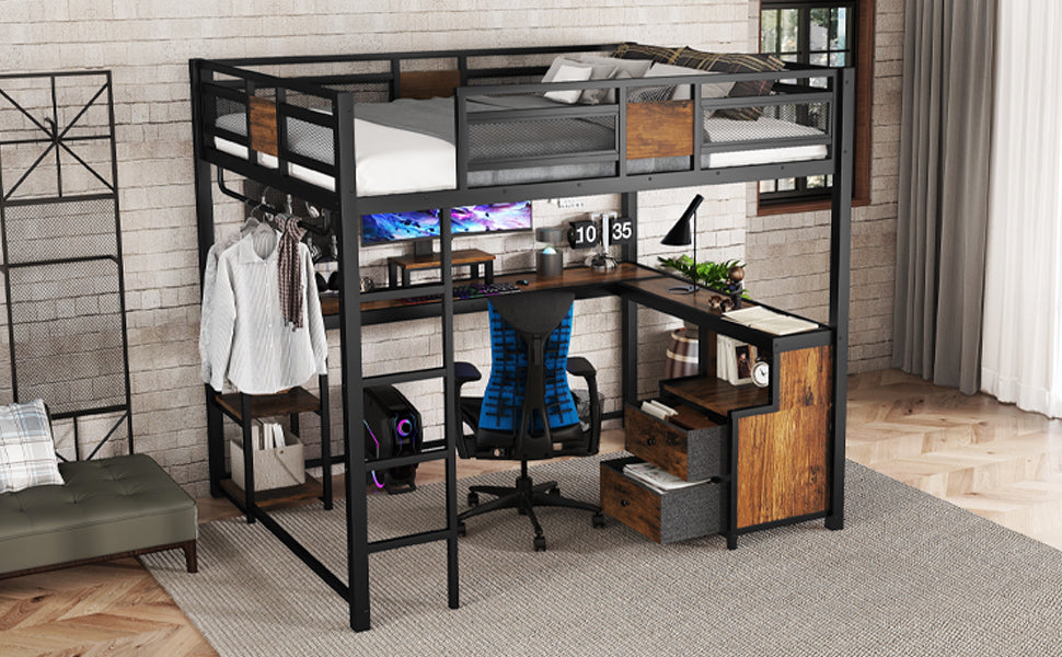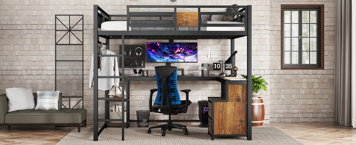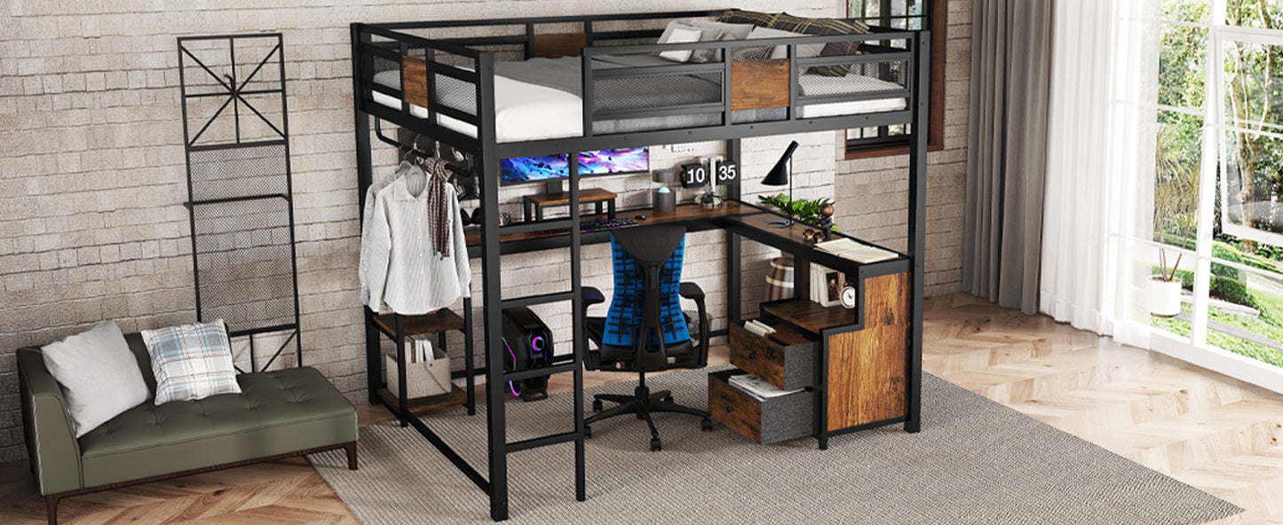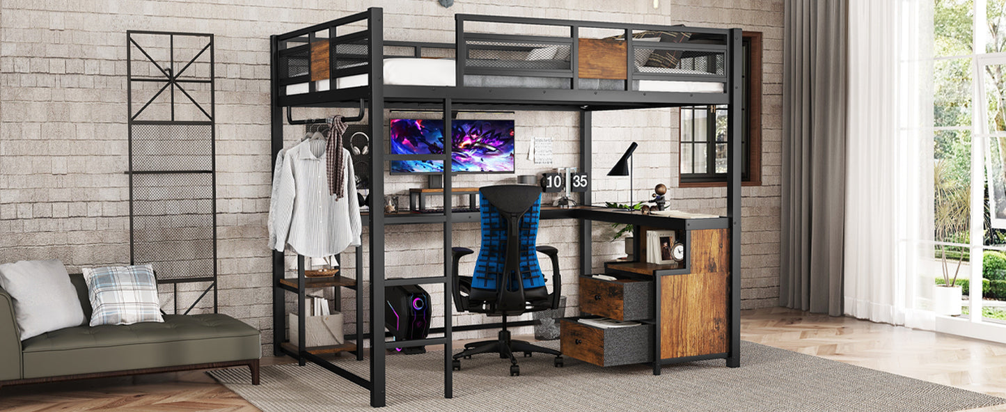 Upgrade your bedroom with this Queen Loft Bed with Desk and Storage, a smart solution for modern living. Designed to save space, this loft bed combines a built-in desk and non-woven fabric drawers, giving you a dedicated workstation and ample storage without taking up extra room. The heavy-duty steel frame with a rust-resistant finish provides long-lasting strength and durability, while the full-length guardrails and sturdy ladders ensure safety at all times. Equipped with rubber plugs, the bed minimizes noise and prevents squeaks for a peaceful sleep experience. Easy-to-follow illustrated instructions and included tools make assembly quick and hassle-free. Perfect for apartments, dorms, and shared spaces, this loft bed queen frame blends functionality, safety, and style to meet your everyday needs.