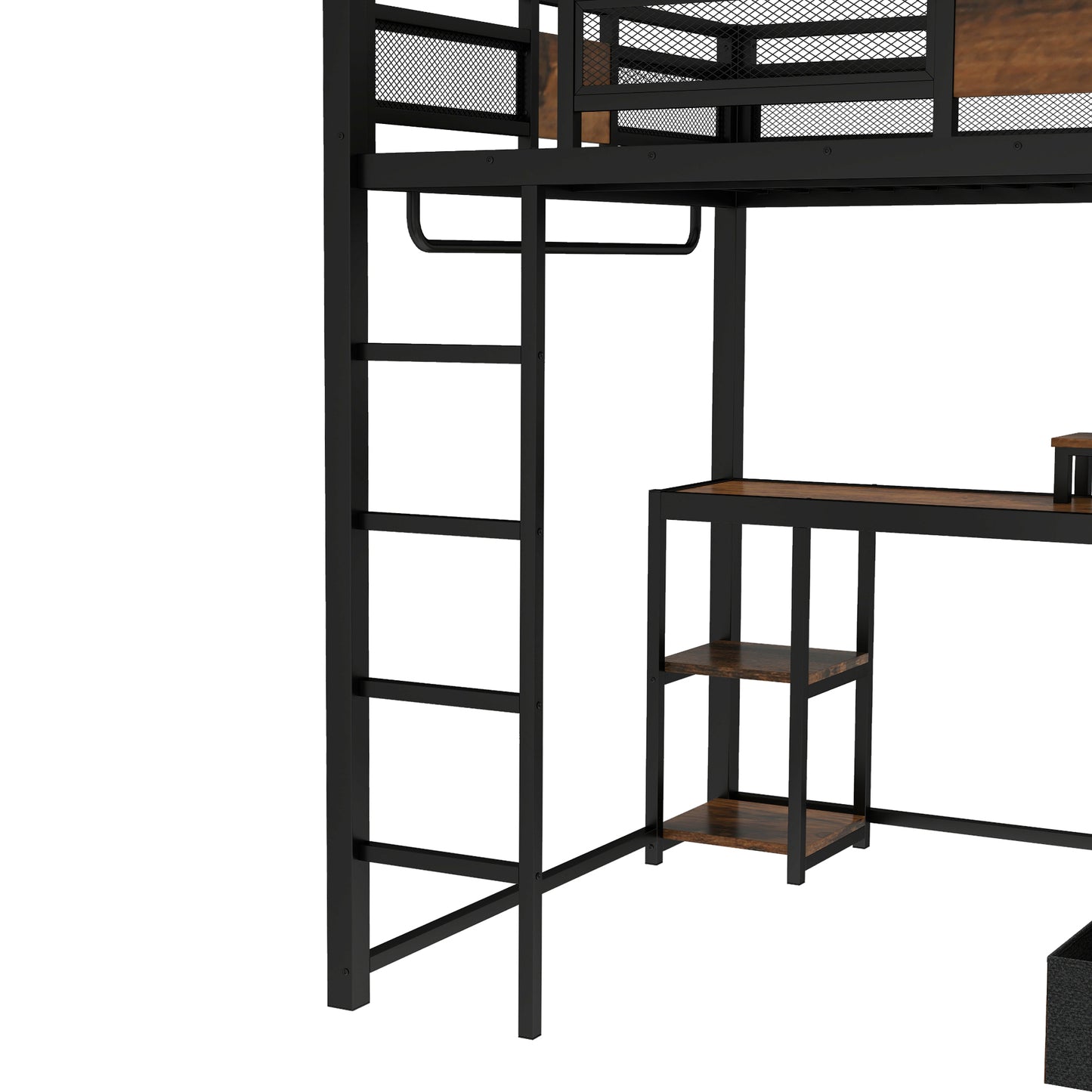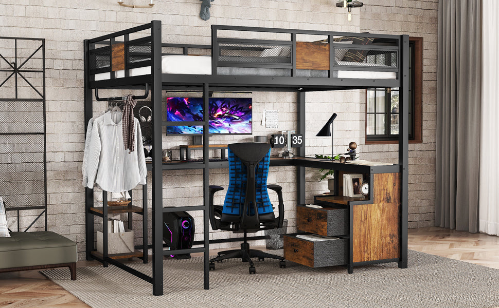 Queen Loft Bed with Desk and Storage Non-woven Fabric Drawers, Metal Loft Bed Frame with Ladders, Nosie-free and No Spring Box Needed, Black