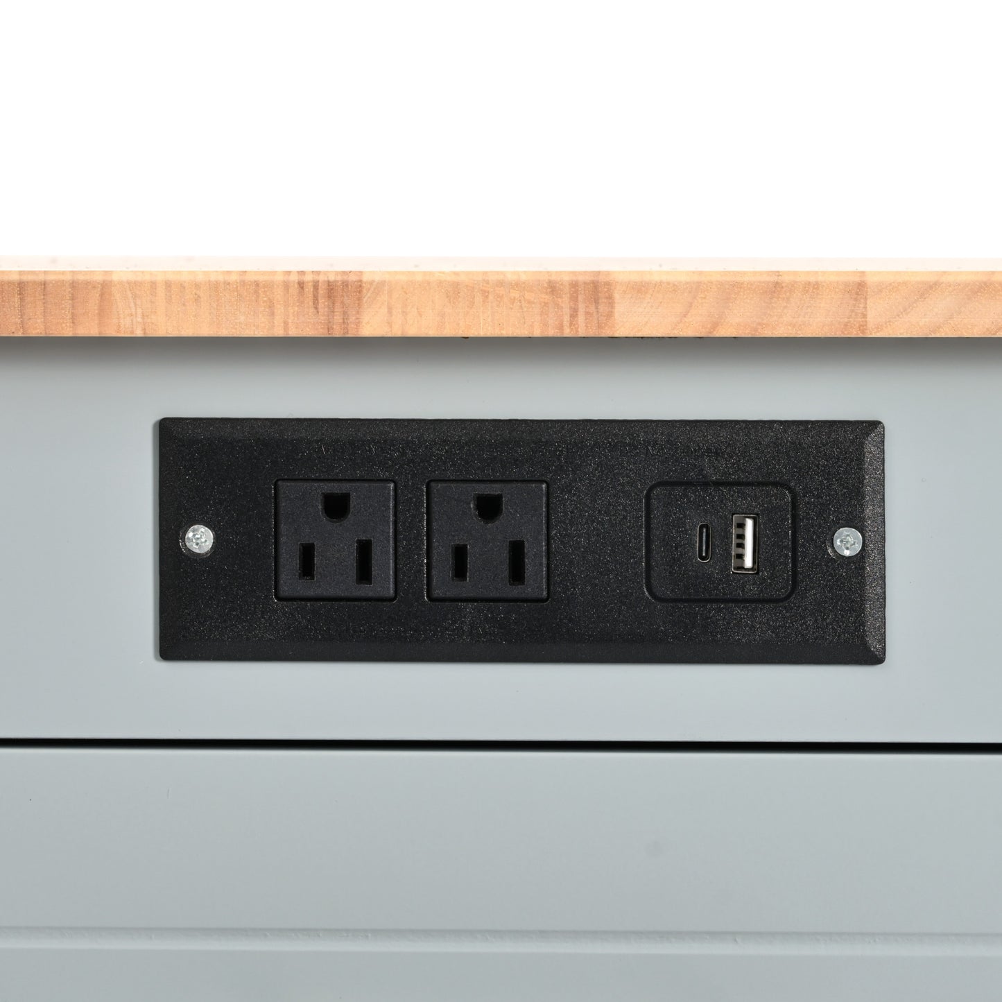 This exquisitely crafted kitchen island boasts a sophisticated built-in charging station, complete with 2 AC outlets, 1 USB port, and 1 Type-C port to accommodate all of your kitchen appliance power needs.
