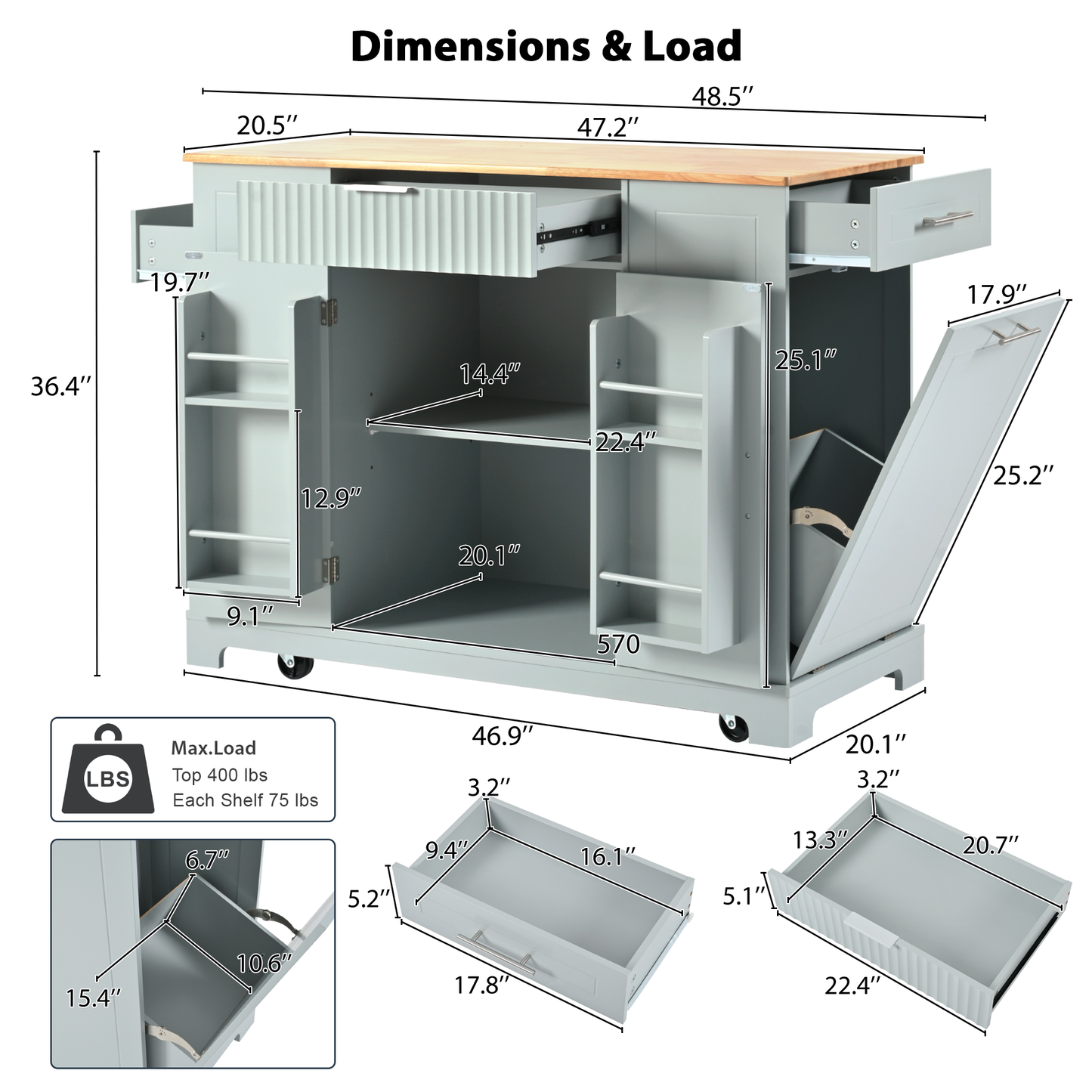Highlights | [Internal Storage Rack][47.25' x 20.5' Wide Rubber Wood Kitchen Table] [Tilt-out Trash Can Cabinet for 10-gallon Trash Can] [Unique Rounded Hinge][Adjustable Cabinet Shelves and Open Side Rack Shelves] [5*360°Smooth Hidden Wheels][Power Outlet 2AC 1USB + 1 Type C] [3 Doors + 3 Drawers][Fluted Large Drawer with Full-extension Rail] [Eco-friendly manufactured P2 MDF Board] |