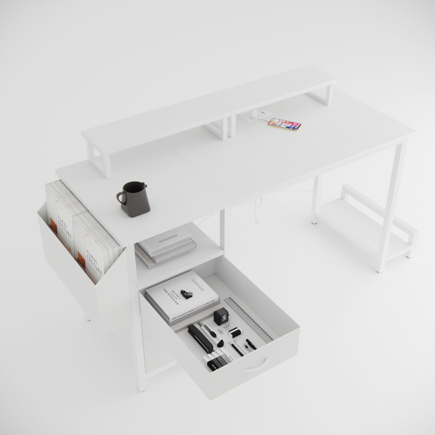 47.3'office desk with power outlet,2 Monitor Stands,2 drawers,Side Pocket,Easy to Assemble,Frame stability Reversible,use for home desk, computer desk, game table,White