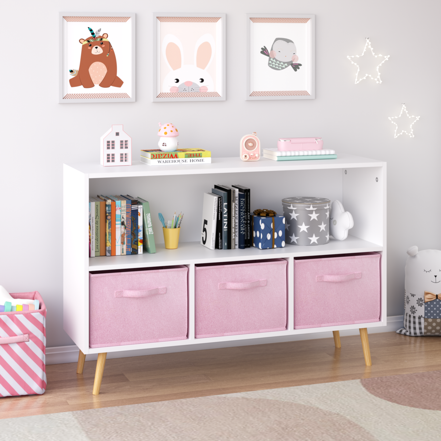 Kids bookcase with Collapsible Fabric Drawers, Children's Book Display, Toy Storage Cabinet Organizer, White/Pink