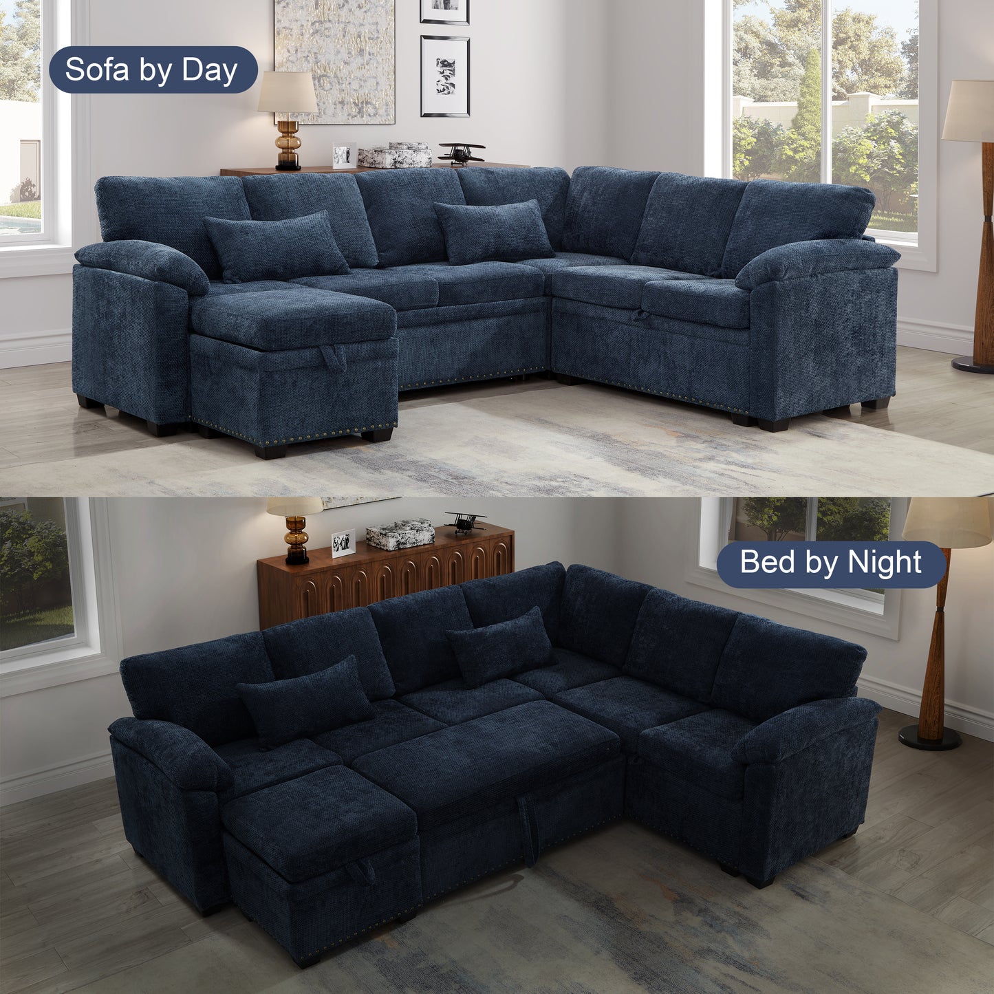 97 Inch L-Shaped Corner Sectional Sofa Couch with Seat and Storage Ottoman,Chenille Fabric Corner Couch with 7 Seats & 2 Pillows for Living Room, Dark Blue