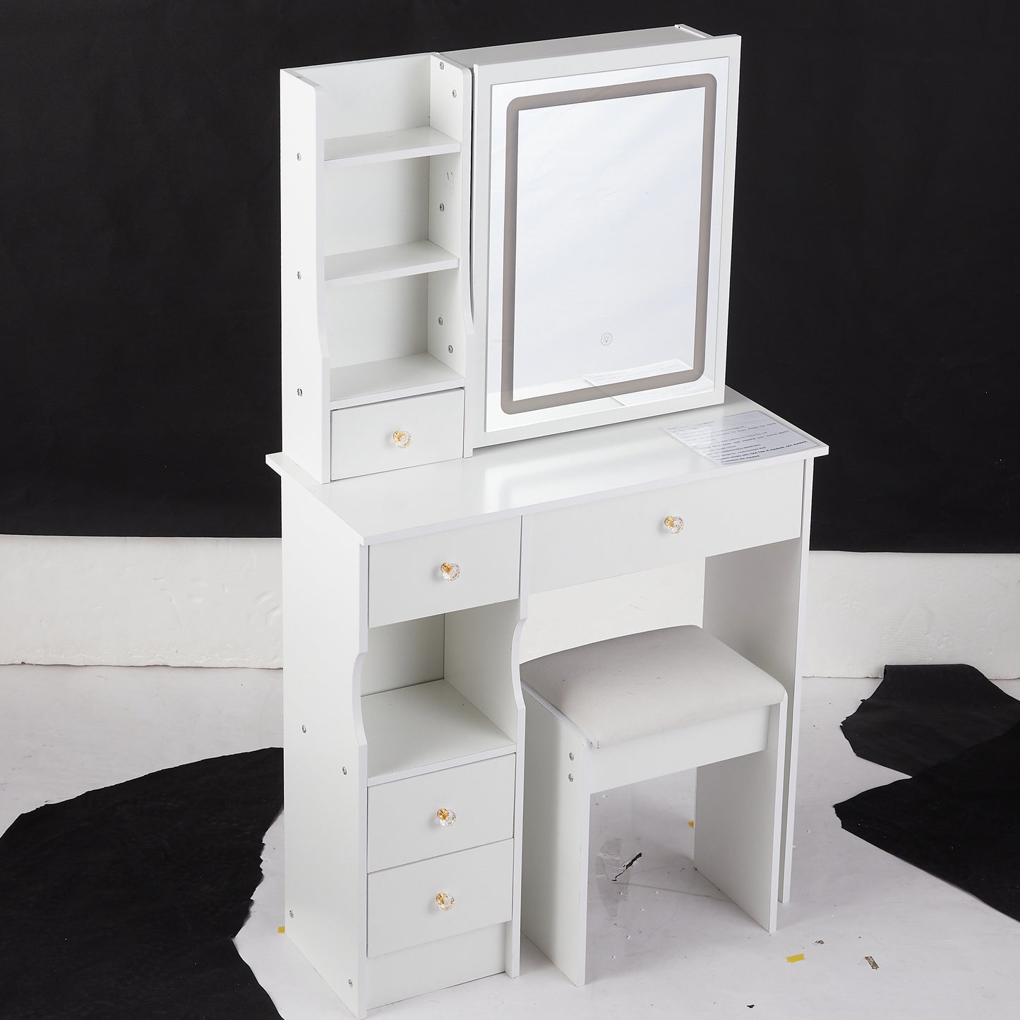 29.2' Small Size Left Drawer Desktop Vanity Table + Cushioned Stool, Large Sliding, Touch Control, Tri-color Switching, Brightness Adjust LED Mirror, High Capacity Storage, Suitable for Small Space