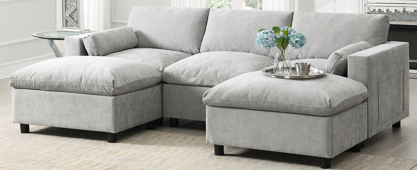 This sofa offers the perfect combination of functionality and comfort. The storage pockets on both sides provide convenient storage options for your belongings, while the removable ottomans offer flexibility in seating arrangements. The Chenille fabric ensures a cozy and comfortable seating experience, and the two free small throw pillows add an extra touch of comfort and style. With its practical features and stylish design, this sofa is a great choice for any living room.