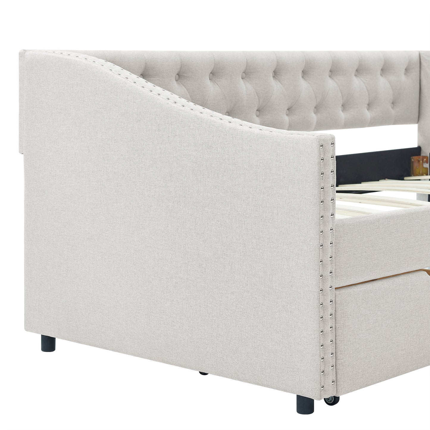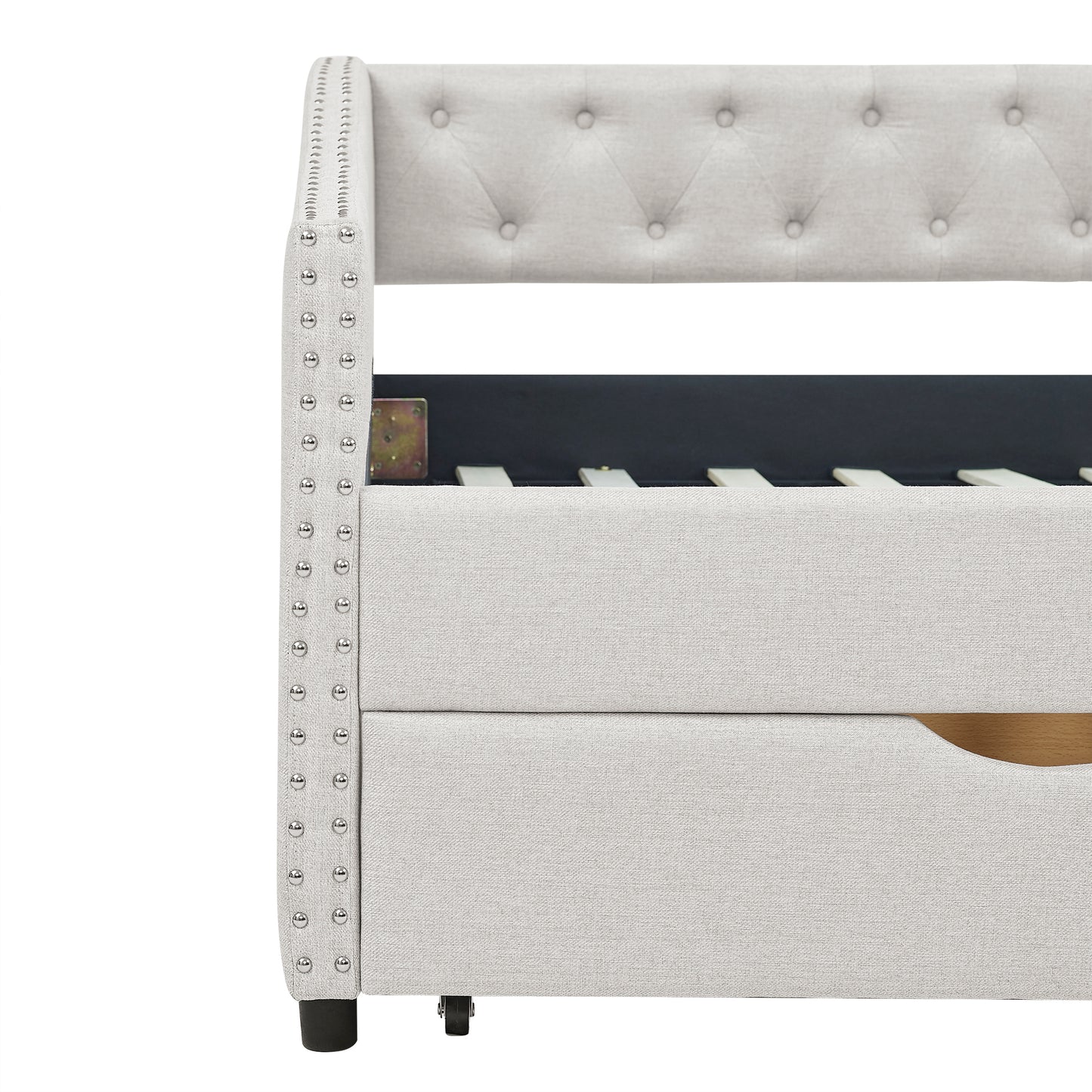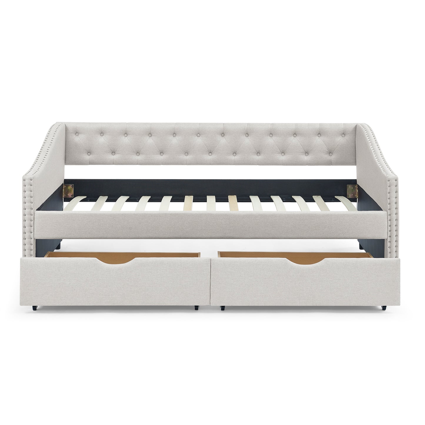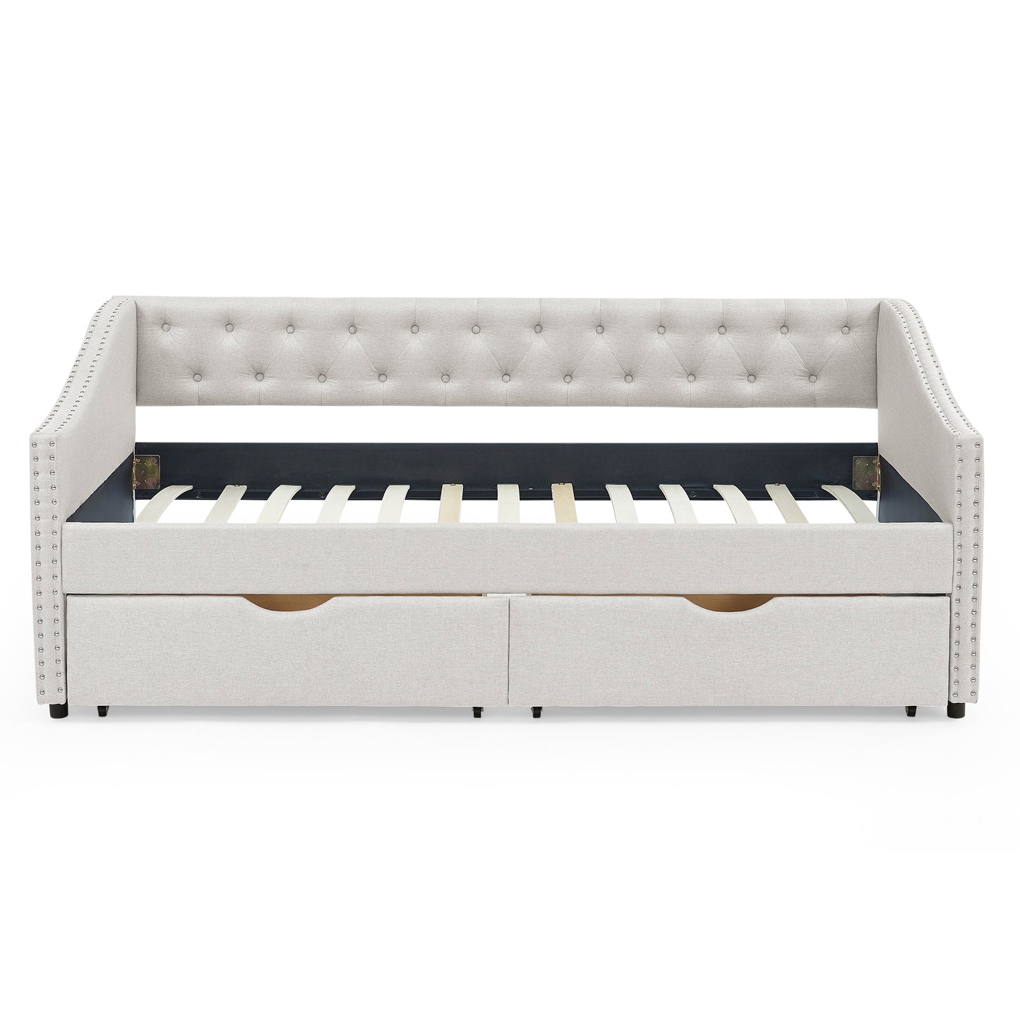 Twin Size Daybed with Drawers Upholstered Tufted Sofa Bed, with Button on Back and Copper Nail on Waved Shape Arms, Beige(81.5''x41''x30.5'')