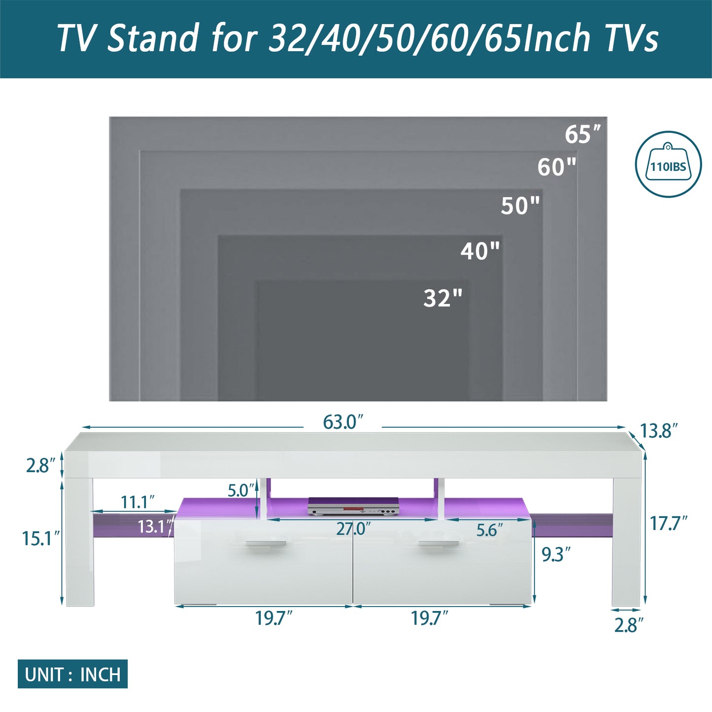 - The size of this TV cabinet:63inch*17.7inch*13.8inch,The whole can support up to 110 pounds, and a single drawer can support up to 30 pounds.this TV console fit up to 65inch TV.