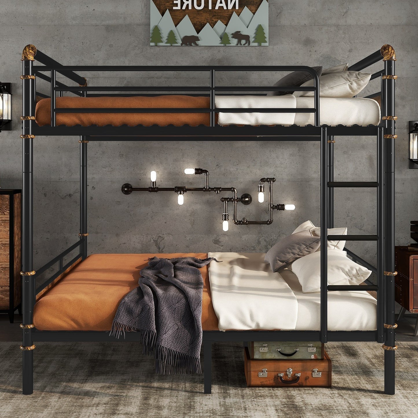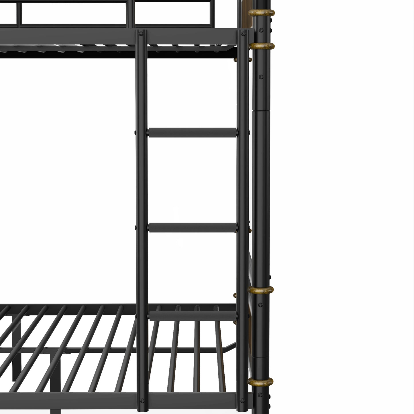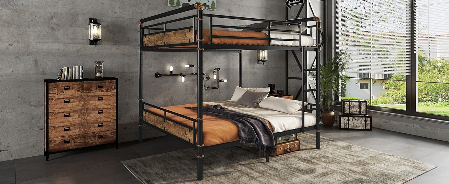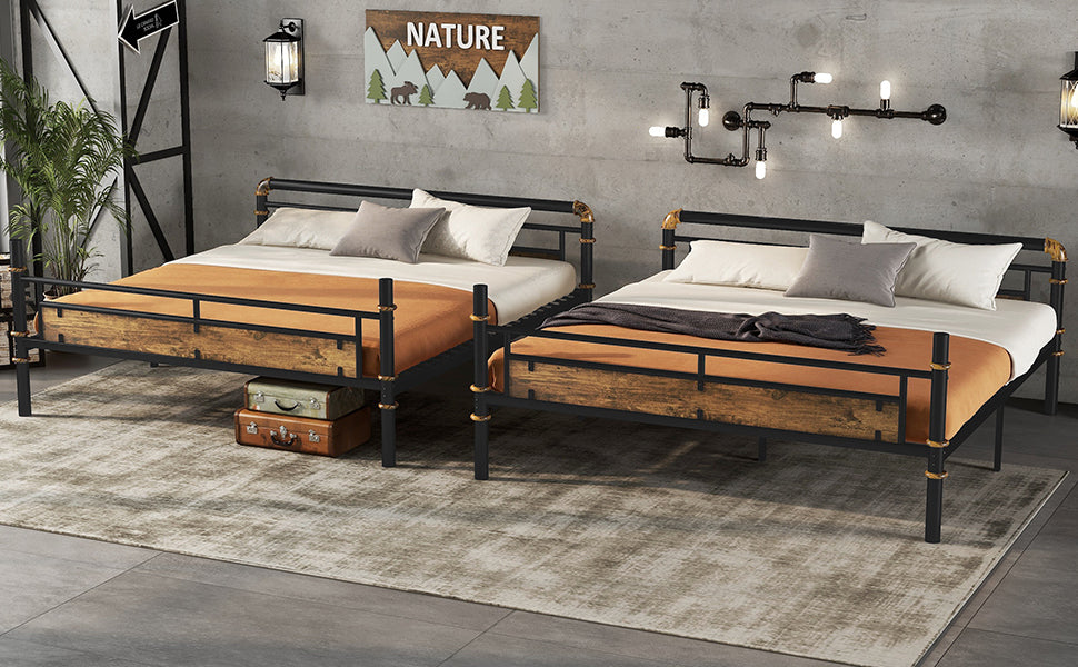 - The metal surface of this queen over queen metal bunk bed is smooth, and all edges are rounded for safety, eliminating the risk of cuts or scrapes. With vintage wood and gold painting accent, this bed fits seamlessly into any bedroom decor, adding a touch of style along with its practical functionality.