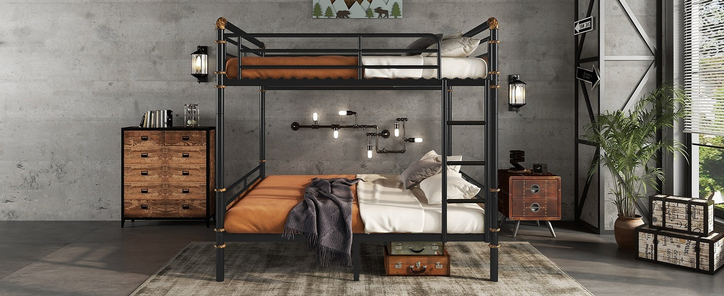 Queen over Queen Metal Bunk Bed, Industrial Detachable Bunkbeds with Safety Guard Rails for Teens, Black(Old SKU W2580S00014)