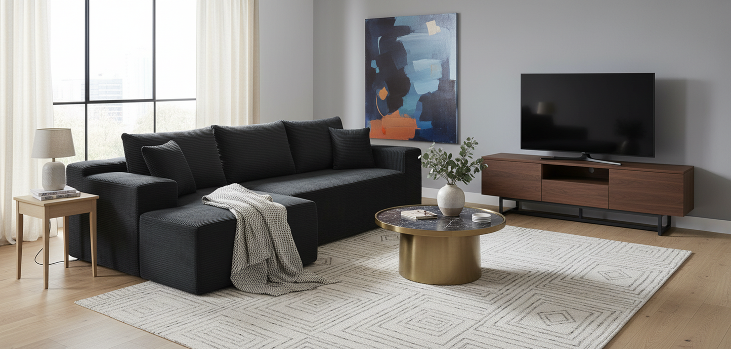 - Upgrade your living space with the Low-Profile L Shaped Sectional Sofa, a versatile piece designed for both comfort and style. Upholstered in soft corduroy fabric, this 3 seater couch adds warmth and texture to your living room while providing a cozy spot for family gatherings, movie nights, or quiet afternoons with a book. Its sleek low-profile silhouette blends effortlessly with any living room furniture style, from contemporary to minimalist.