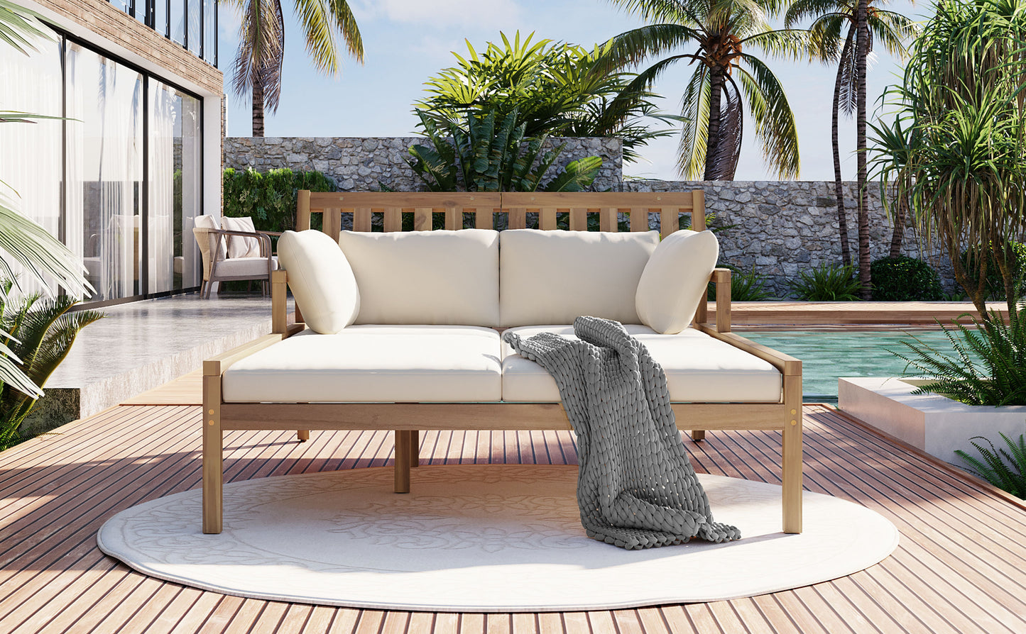 TREXM Outdoor Daybed, Patio Daybed with Four Pillows, Wooden Outdoor Bed with Curved Armrests for Poolside, Backyard, Garden (Light Teak+Beige Cushion)
