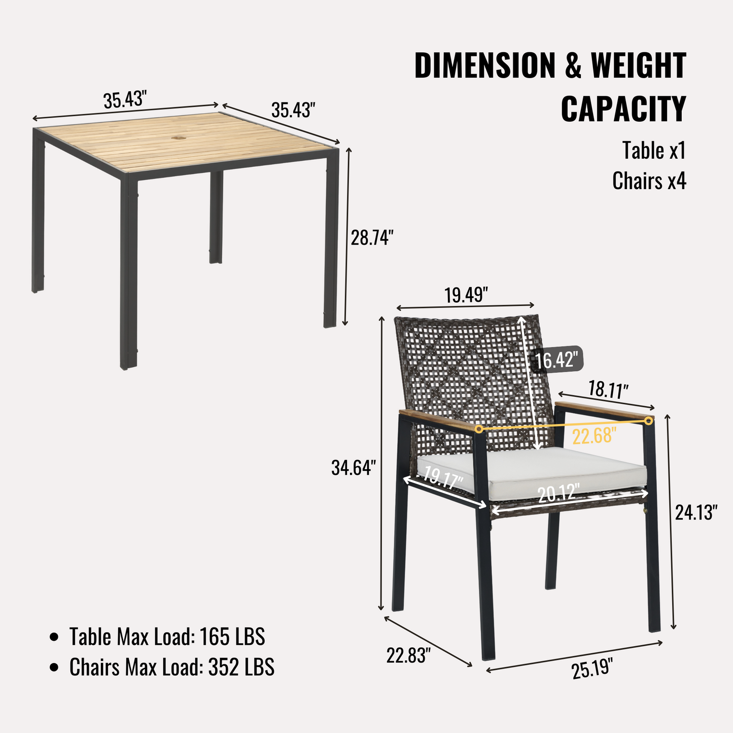 - ONE SET: includes Four chair size 22.83 x 25.19 x 34.64 inches; One table size 35.43 x 35.43 x 28.74 inches, clear instruction paper and extra a free part of hardware for replacing in case needed.