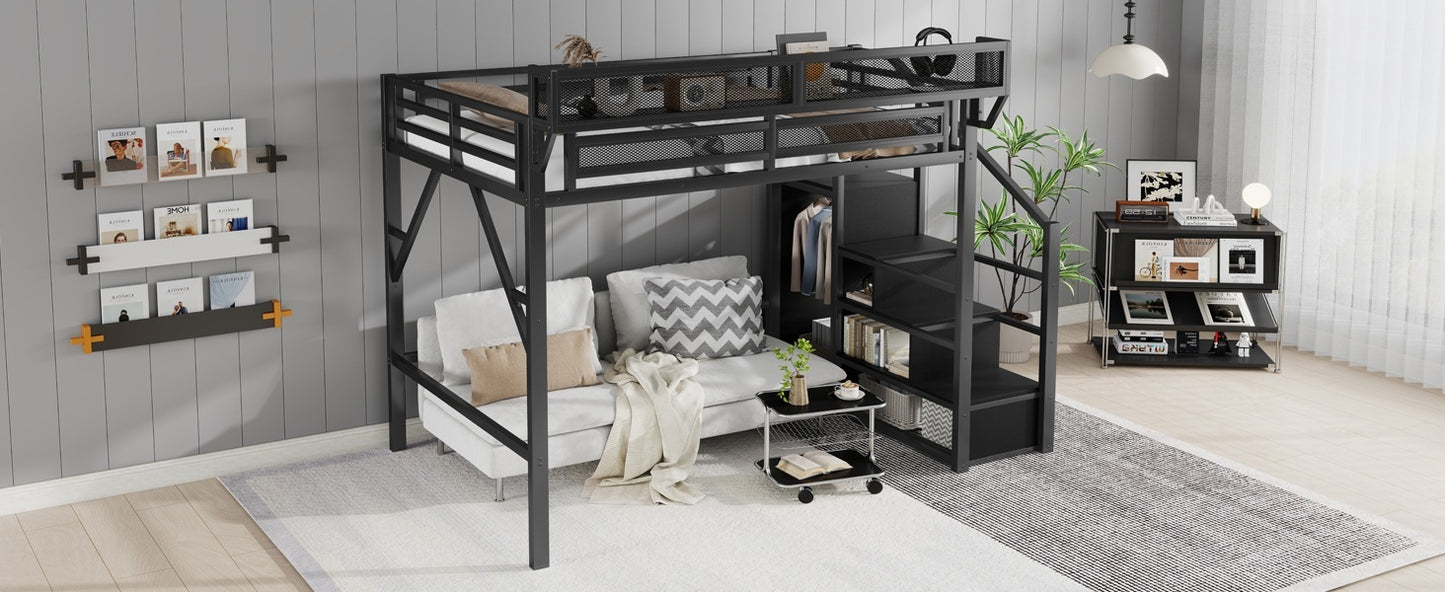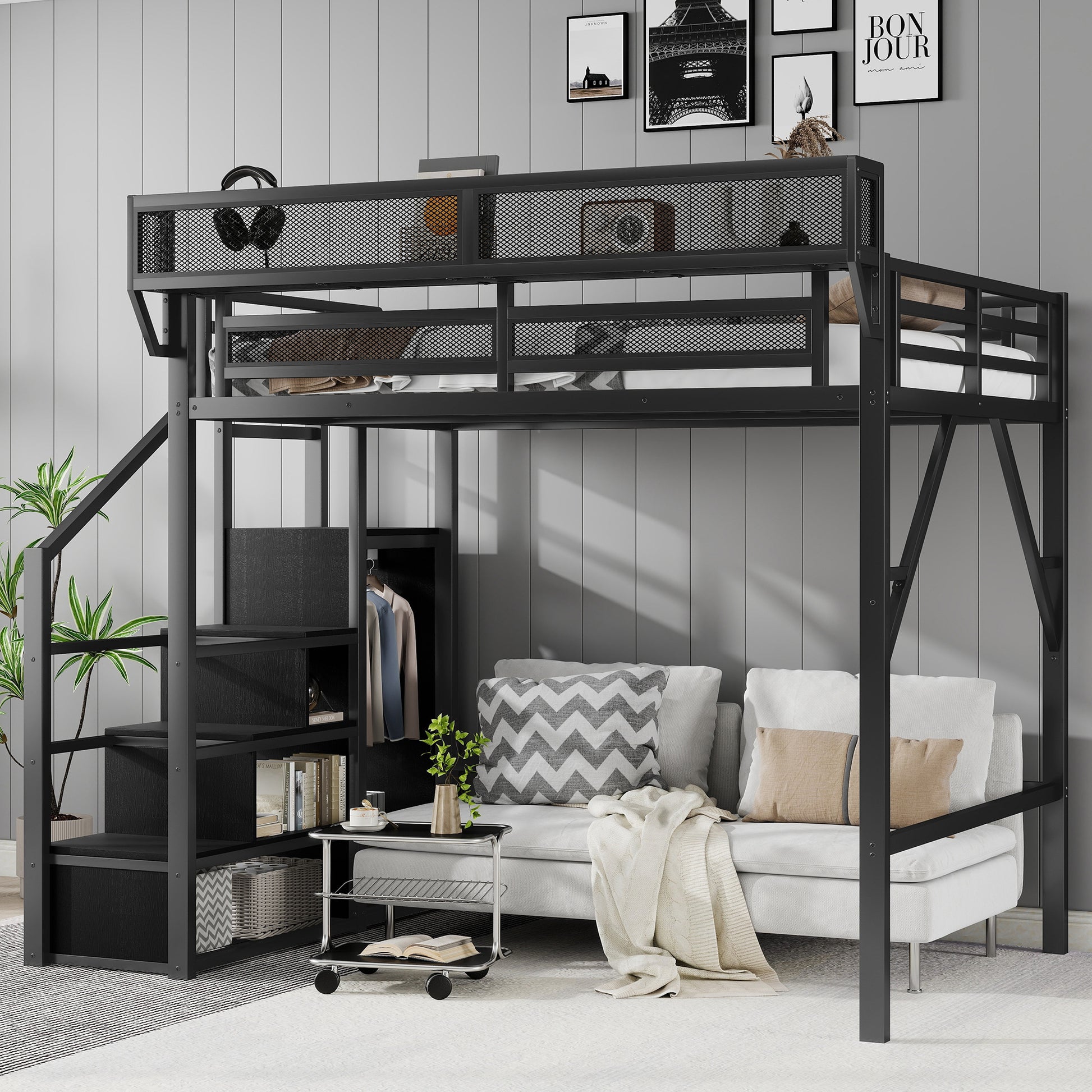Full Size Loft Bed with Stairs, Metal Full Loft Bed with Storage Shelves, High Loft Bed with Wardrobe for Kids Teens, Black(Expect Arrival Date 2025/9/20)