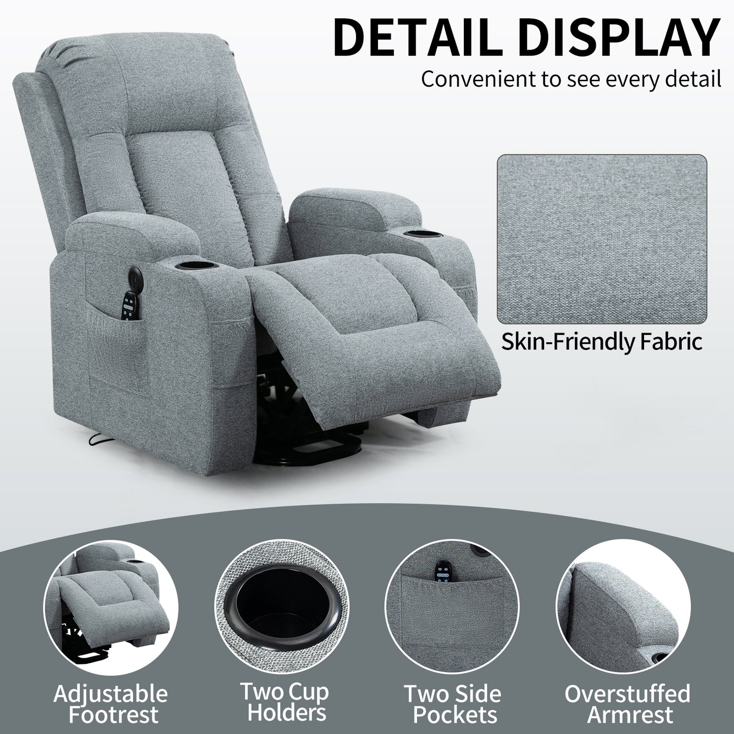 Infinite Position Single Motor Up to 350 LBS Power Lift Recliner Chair for Elderly, Heavy Duty Motion Mechanism with 8-Point Vibration Massage and Lumbar Heating, USB Charging Port, Cup Holders, Grey