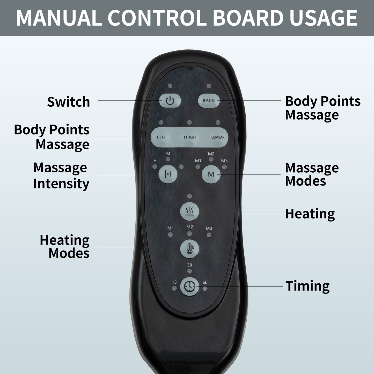 It comes with 8 vibrating nodes (back, lumbar, thighs, legs) and 3 massage modes for selection, each massage point can be operated individually. You can choose to massage a specific part separately. There is timer function in 15/30/60 minutes which is convenient for you to set massaging time. Add a lumbar heat point to promote blood circulation throughout your body, providing a full body relaxation!