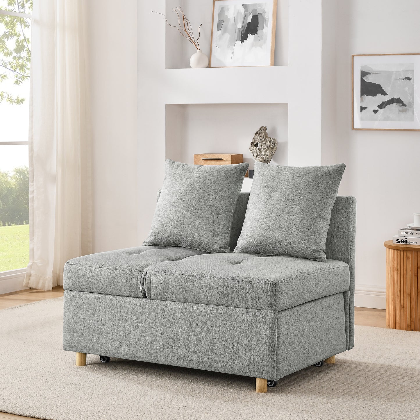 Convertible Sleeper Sofa Chair Adjustable Backrest Recliner with Pullout Sofa Bed with Wheels, Modern Linen Fabric for Living Room for Tight Spaces, Grey