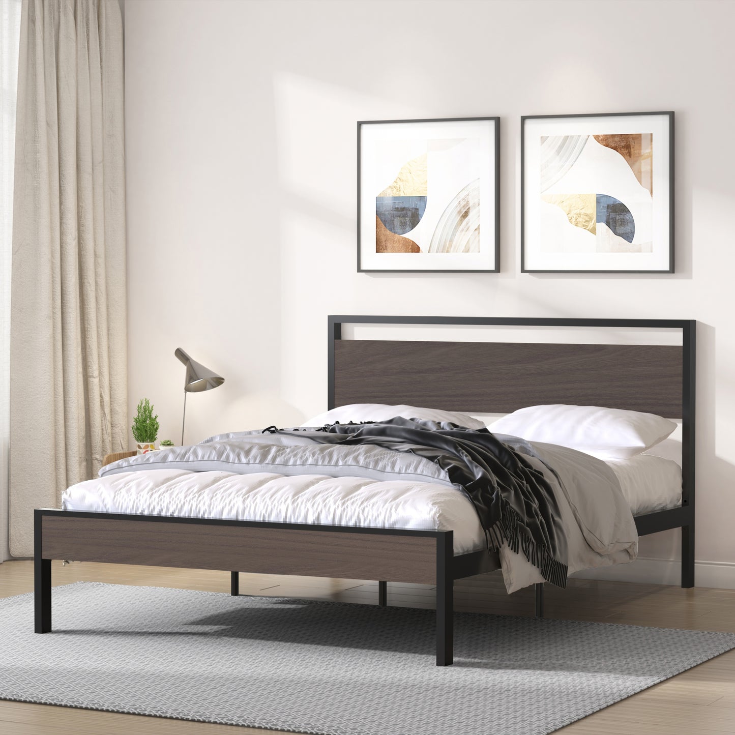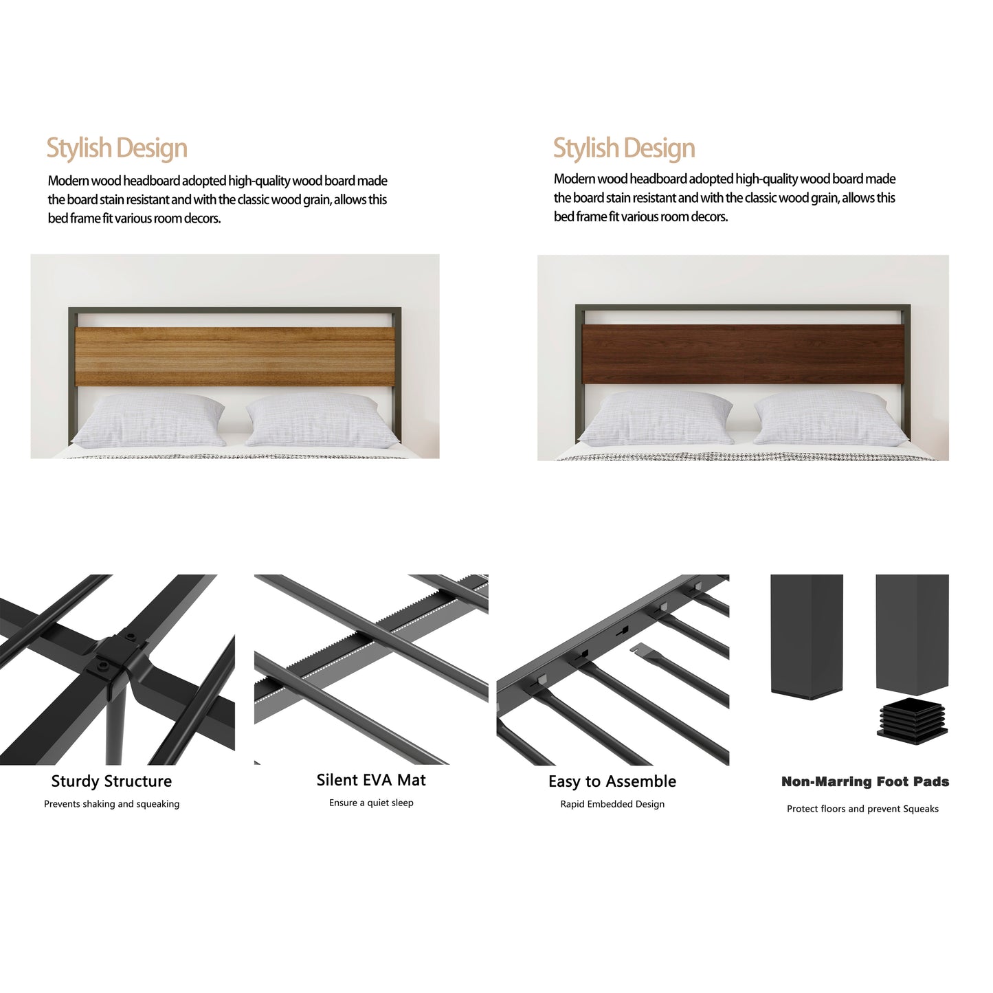 Ceres Queen Size Metal Platform Bed Frame with Wooden Headboard and Footboard, Mattress Foundation, No Box Spring Needed, Large Under Bed Storage, Non-Slip Without Noise, Walnut
