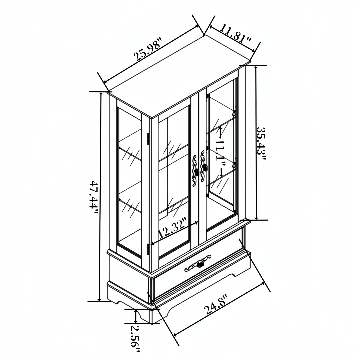 - Spacious and Elegant Cabinet:This exquisite curio cabinet, featuring glass doors, boasts a total of 3 shelves and a big drawer that offer ample and versatile storage space. It includes one fixed wooden shelf and two adjustable tempered glass shelves, each capable of holding between 15 to 22 pounds. This cabinet is perfect for storing books、wine、 or collectibles.
