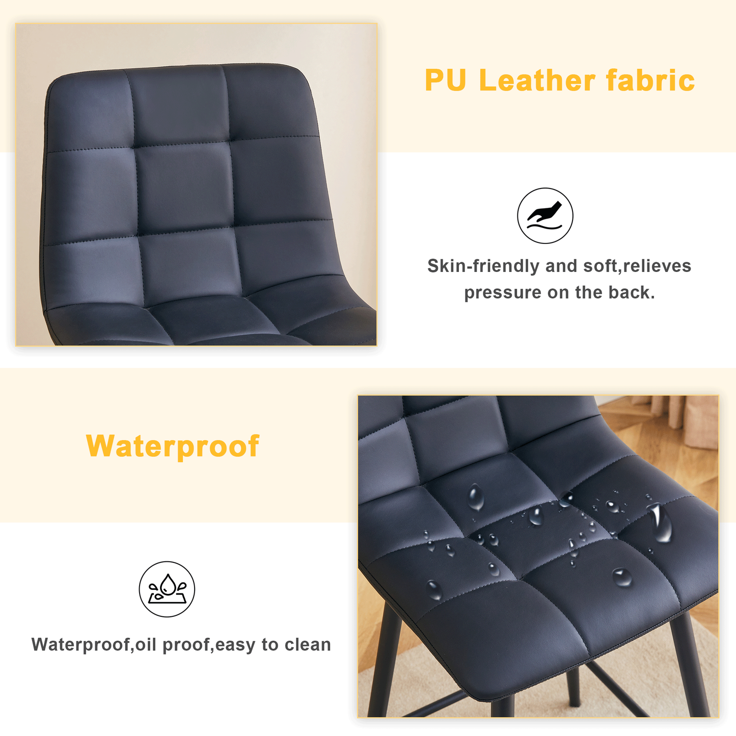 - Overall Black Design: The bar chairs feature a stylish all-black design that complements a variety of home decor styles and adds a modern touch.Easy to Clean: The PU surface is smooth, making it easy to wipe and keep the chairs tidy.