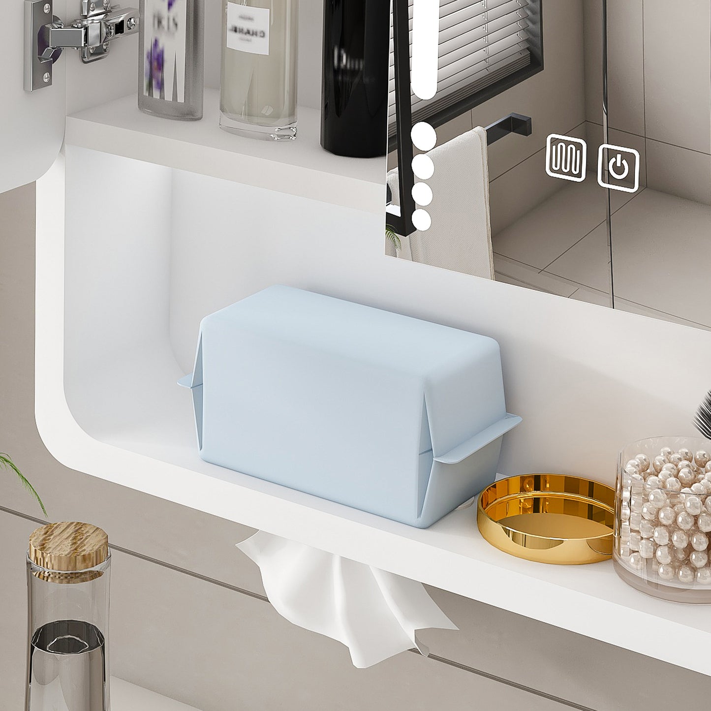 - Evenly Diffused LED Lighting:Four strategically placed internal LED strips provide uniform, shadow-free light across every shelf. This creates a soft glow that reduces eye strain and offers a clear view of all contents, enhancing your daily routine.
