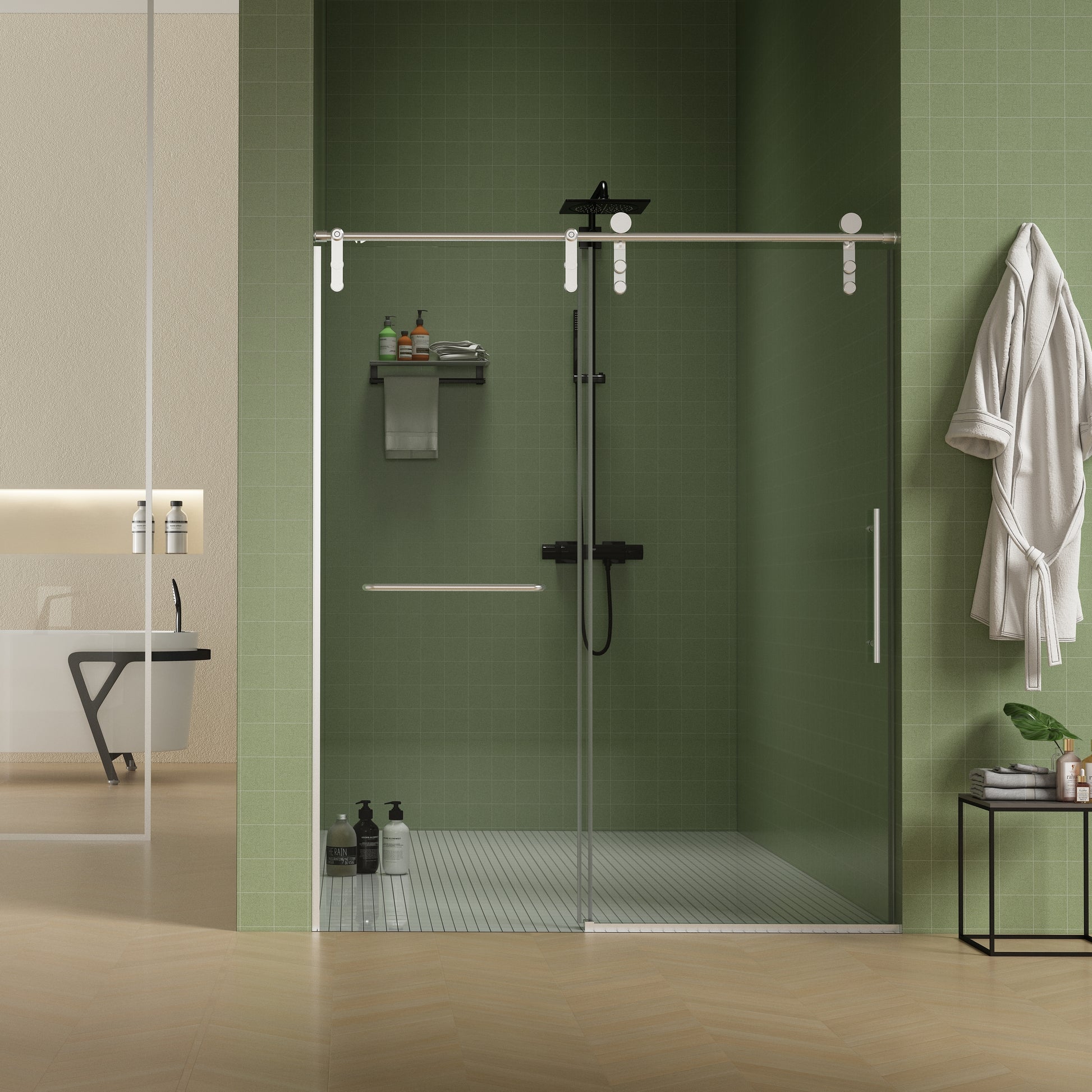 56'-60'W x 70'H Frameless Shower Door, Sliding Shower Door, Premium 5/16'(8mm) Thick Tempered Glass Shower Enclosure with Towel Bar ,Double Side Easy Clean Coat,Brushed Nickel Finished With Buffer