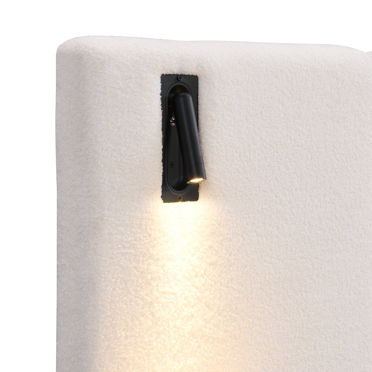 Chic Boucle Upholstered Bed with Integrated Lights and Shelves, White, King