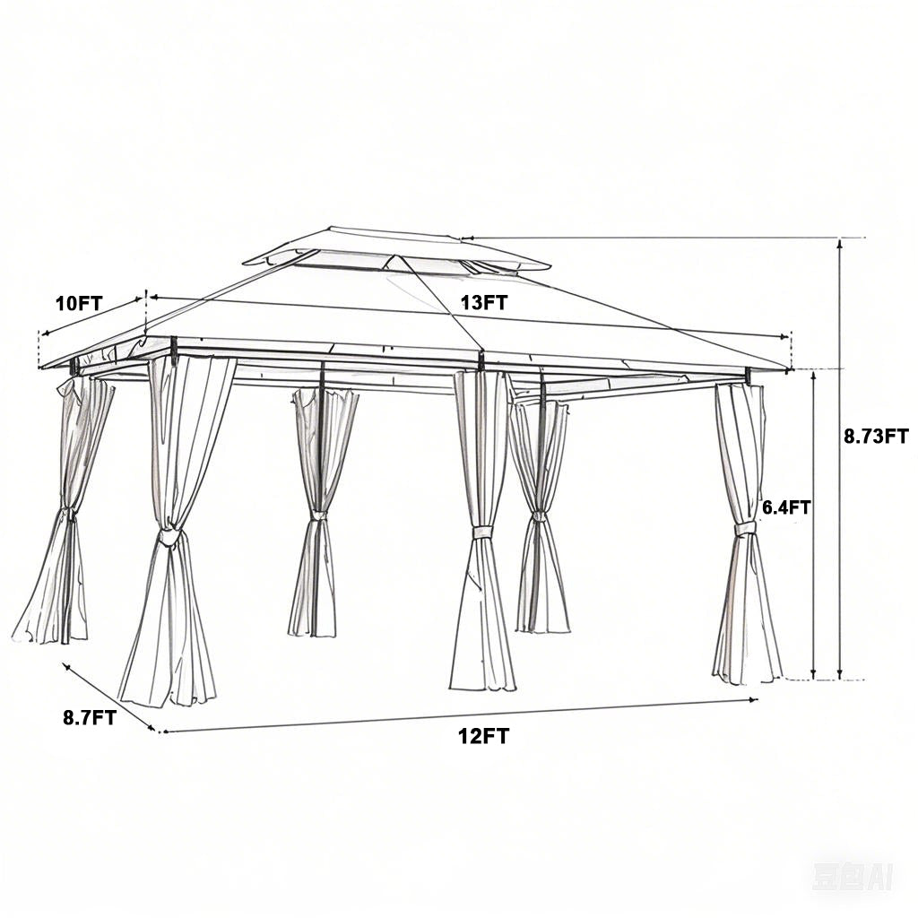 - 【Large Space Canopy】This 13 x 10 gazebo provides enough shade for you and your family's daily leisure activities. You can place a dining table or a set of sofas inside the gazebo, which can accommodate3-4people for outdoor entertainment for you and your friends.
