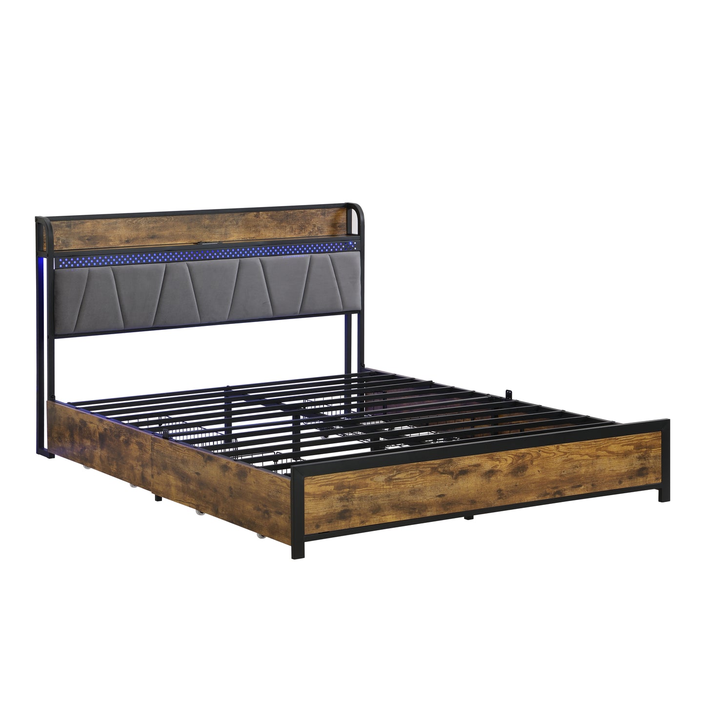 Queen Size Bed Frame, Storage Headboard with Charging Station and 4 Storage Drawers,LED Lights , Brown and Gray