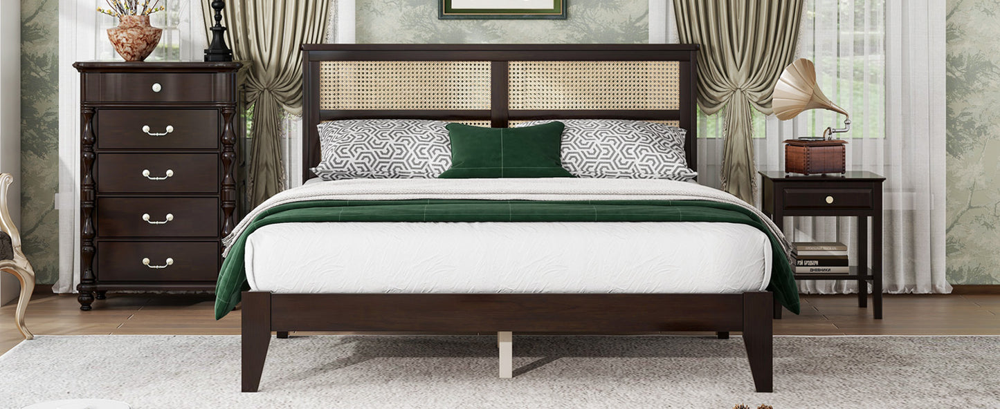 Queen Size Rubber Wooden, Solid Wooden Bed with Rattan Headboard, Enhanced by Support Feet,Espresso