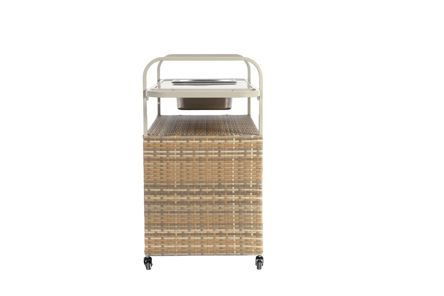 Outdoor Bar Table, Wicker Bar Cart with Cabinet, Patio Serving Cart with steel Top, with one ice bucket,Lockable Wheels, Side Basket for Garden, Poolside & Backyard, Beige
