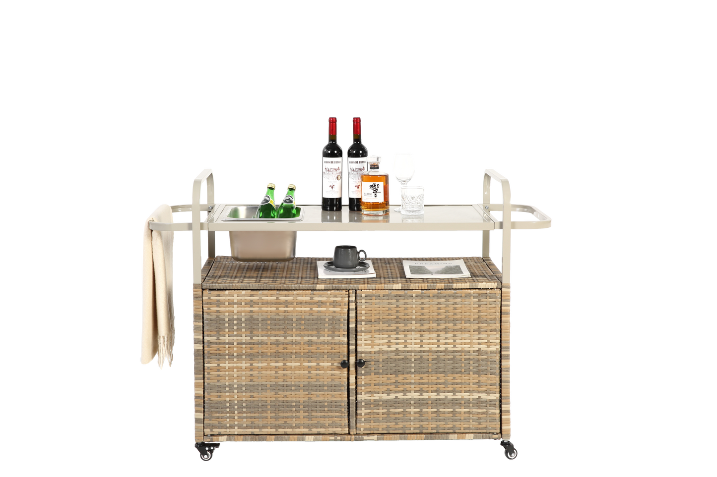 Outdoor Bar Table, Wicker Bar Cart with Cabinet, Patio Serving Cart with steel Top-Beige