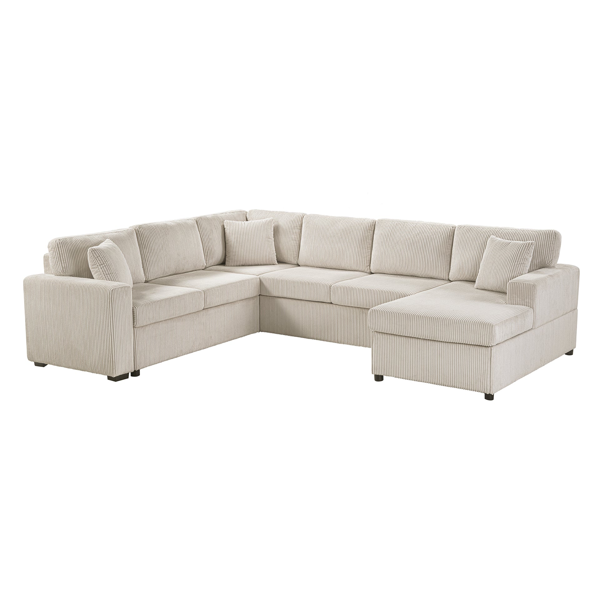 This U-shaped sectional sofa is designed for ultimate comfort and style, featuring generous seat depth and thick cushions for a relaxing seating experience. The luxurious corduroy upholstery adds a soft, textured feel while ensuring durability. Its versatile chaise lounge offers a perfect spot to stretch out, whether you're reading or relaxing. The sofa comes with three soft throw pillows that enhance both comfort and aesthetic appeal. With its modern U-shaped design, this sectional maximizes seating capacity, making it ideal for larger spaces and perfect for family gatherings or socializing with friends.